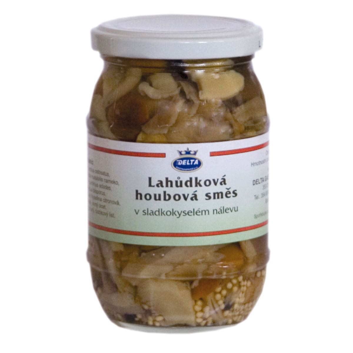 Lahůdková houbová směs ve sladkokyselém nálevuObj.č.: 201EAN: 8594061132012Balení: Ve skle, 370 ml, 12 ks v kartonu (2.4 kg)Prodejní jednotka: SkloMinimální trvanlivost: 36 měsícůSložení: Hlíva ústřičná, opěnka měnlivá, houževnatec jedlý, žampiony, voda, kuchyňská sůl, cukr, kyselina citronová, kyselina askorbová, vinný ocet, semínka hořčice, pepř celý, bobkový list.