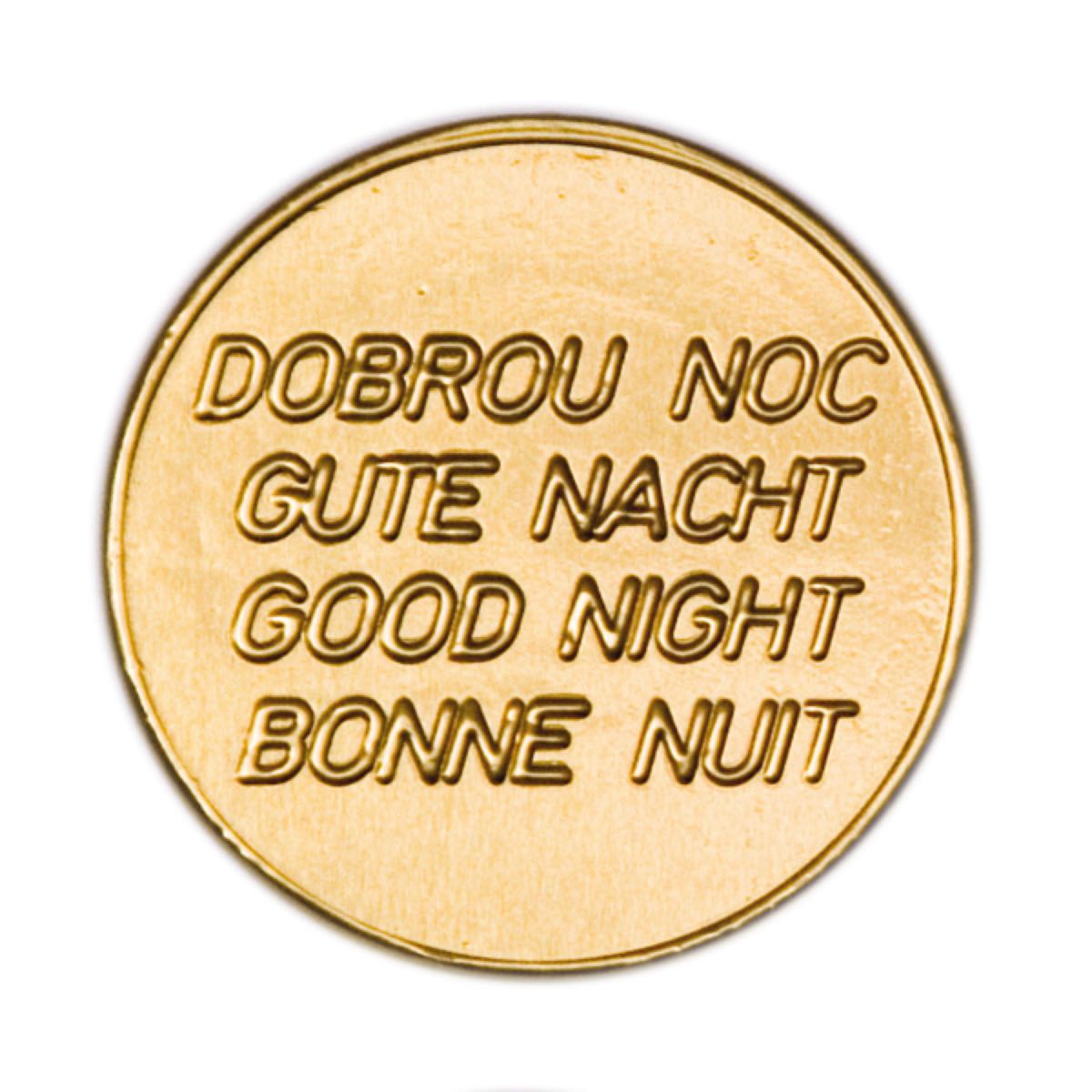 Čokoládové mince průměr 36 mmMince ve zlaté fólii s oboustranným textem: “Dobrou noc”, “Gute nacht”, “Good night”, “Bonne nuit”Obj.č.: 221EAN: 8413907669324Balení: 300 ks v kartonuProdejní jednotka: KartonMinimální trvanlivost: 18 měsícůSložení: Cukr, kakaové máslo, plnotučné sušené mléko, kakaová hmota, lecitin, vanilín.
