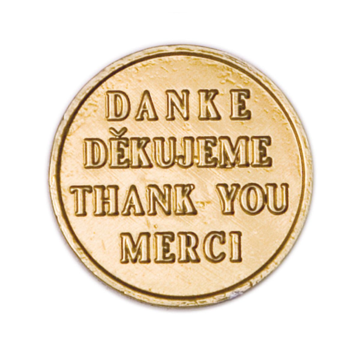 Čokoládové mince průměr 28 mmMince ve zlaté fólii s oboustranným textem: “Děkujeme”Obj.č.: 222EAN: 8413907712129Balení: 300 ks v kartonu (á 2.4 g)Prodejní jednotka: KartonMinimální trvanlivost: 18 měsícůSložení: Cukr, kakaové máslo, plnotučné sušené mléko, kakaová hmota, lecitin, vanilín.