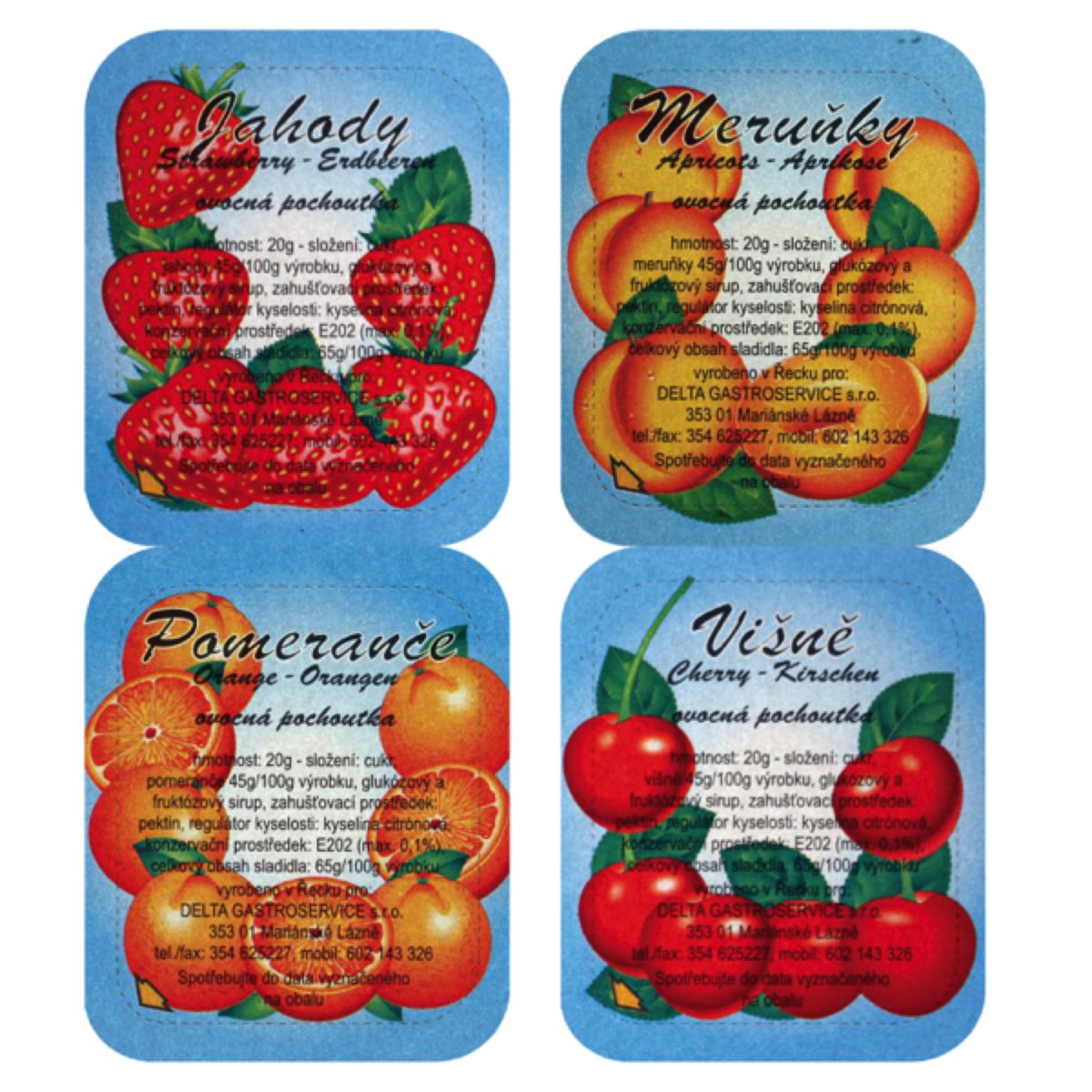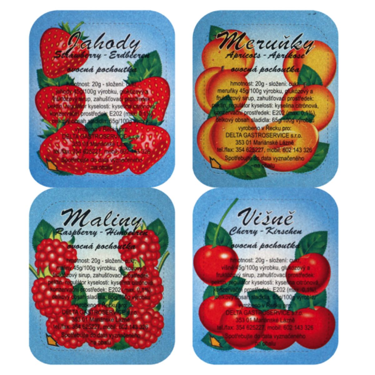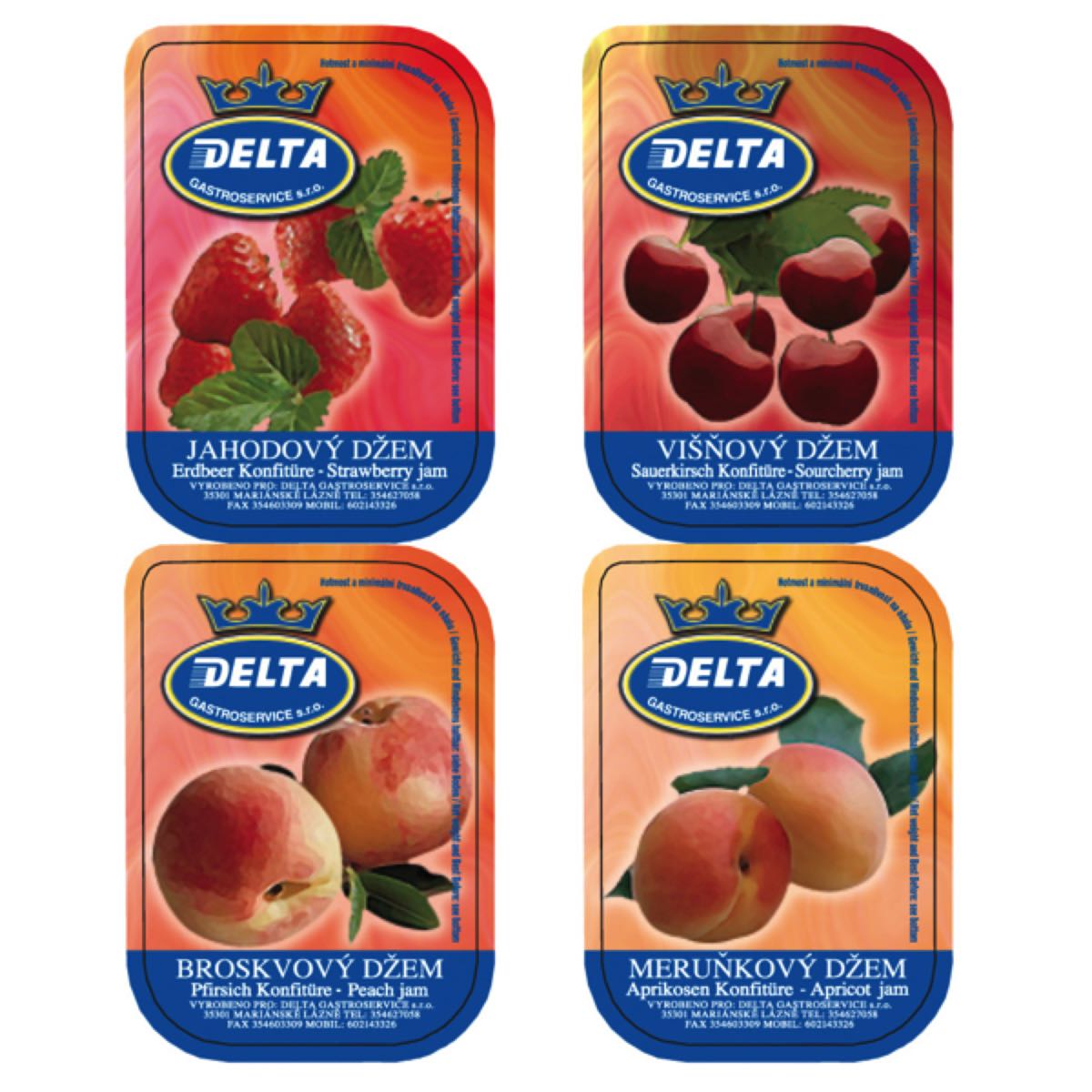 DELTA IIISortiment 4 druhů (4 x 25 porcí – jahody, meruňky, višně, broskve)Obj.č.: 141EAN: 8594061131411Balení: V kartonu 100 porcí á 20 gProdejní jednotka: KartonMinimální trvanlivost: 18 měsícůSložení: Glukózový a fruktózový sirup, ovoce – 35 g na 100 g výrobku, cukr, zahušťovací prostředek – pektin, karubin, regulátor kyselosti – kyselina citronová. Celkový obsah cukru – 60 g na 100 g výrobku. Bez chemických konzervačních prostředků.