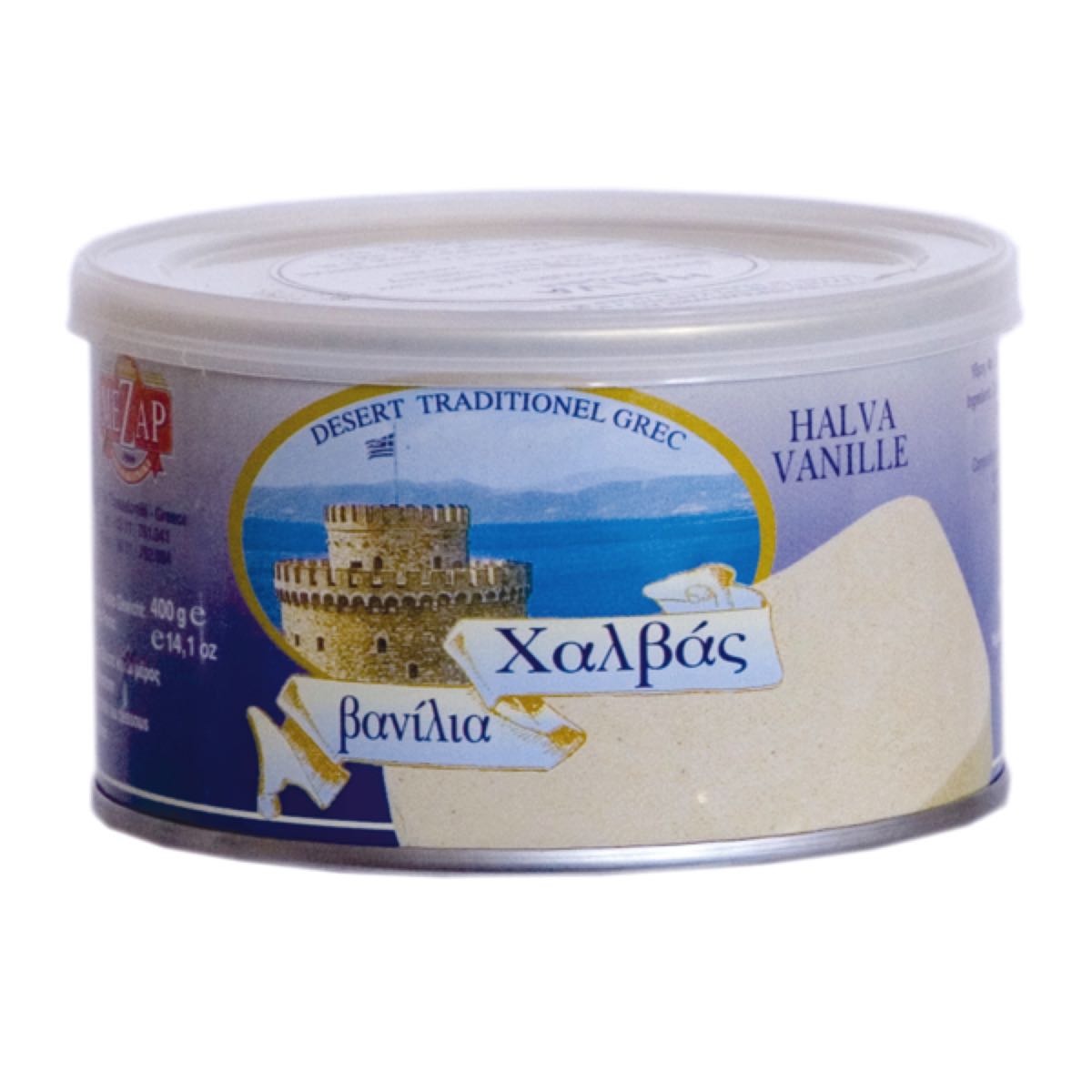 Halva s přírodní vanilkovou příchutíObj.č.: 231EAN: 5201381235783Balení: Dóza, 400 g, 12 ks v kartonu (4.8 kg)Prodejní jednotka: DózaMinimální trvanlivost: 24 měsícůSložení: Sezamová pasta, cukr, hroznový cukr, rostlinný olej, aroma, vanilín.