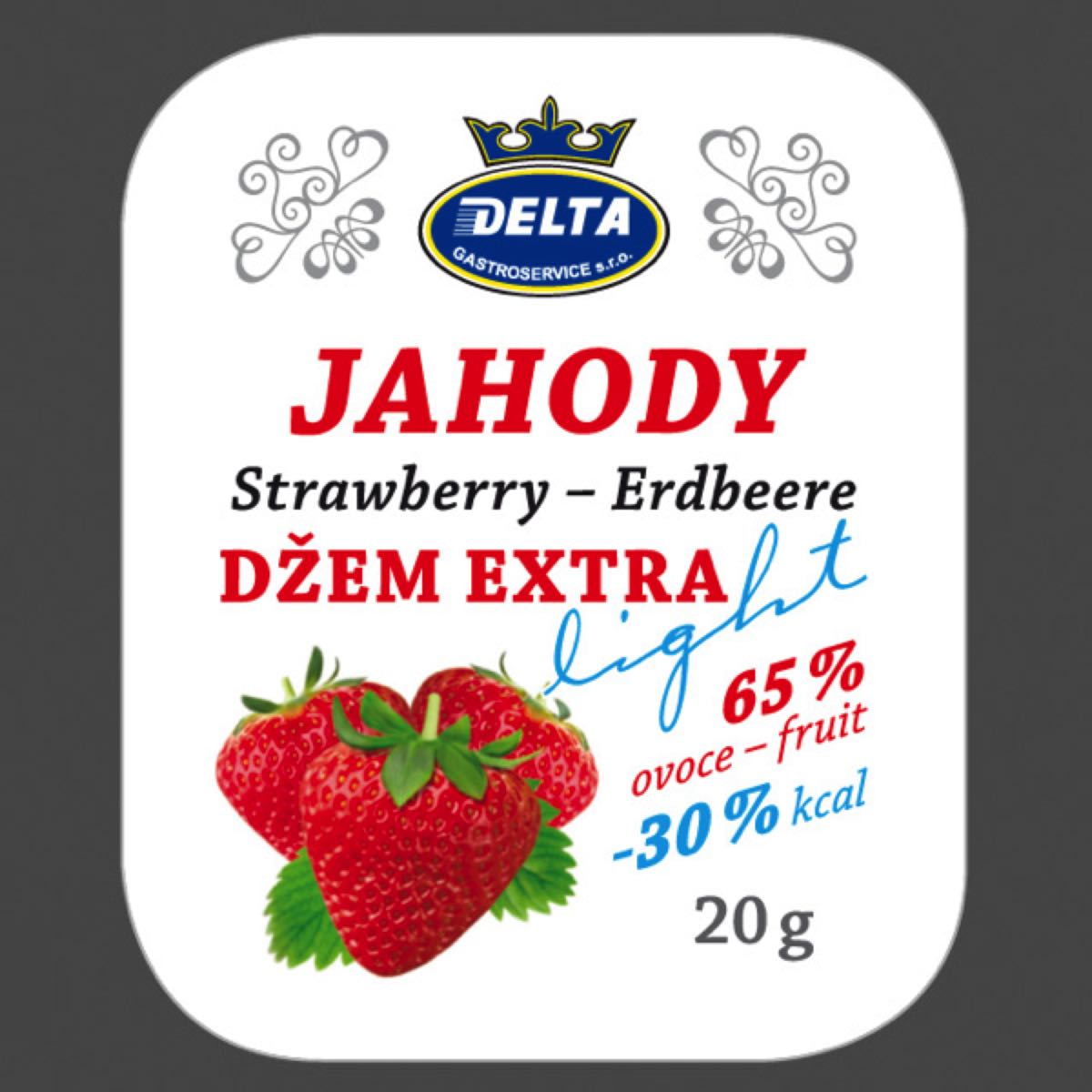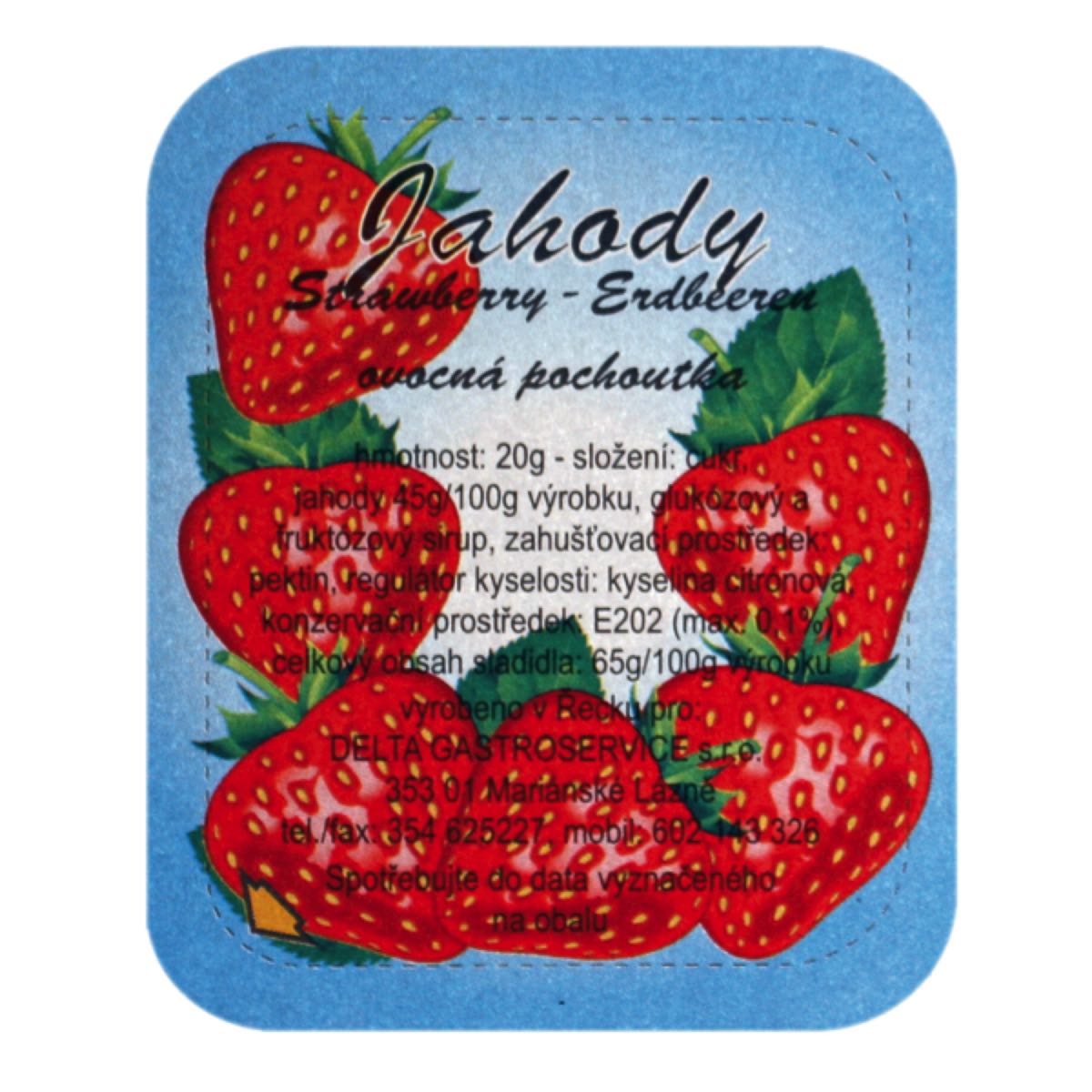 DELTA – jahodyObj.č.: 181EAN: ---Balení: V kartonu 168 porcí á 20 gProdejní jednotka: KartonMinimální trvanlivost: 18 měsícůSložení: Cukr, jahody – 45 g na 100 g výrobku, glukózový a fruktózový sirup, zahušťovací prostředek – pektin, regulátor kyselosti – kyselina citronová, konzervační prostředek – E 202 (max. 0,1 %). Celkový obsah cukru – 65 g na 100 g výrobku.
