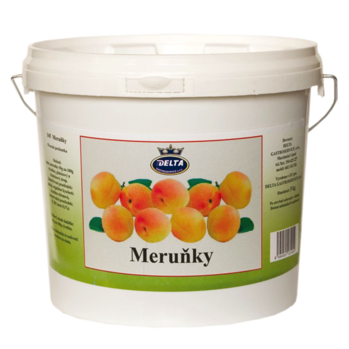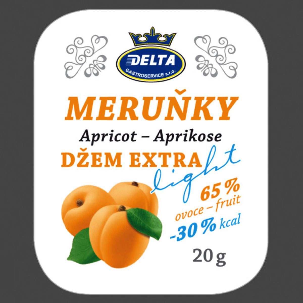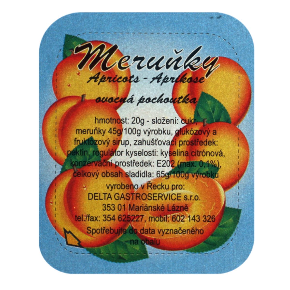 DELTA – meruňkyObj.č.: 182EAN: ---Balení: V kartonu 168 porcí á 20 gProdejní jednotka: KartonMinimální trvanlivost: 18 měsícůSložení: Cukr, meruňky – 45 g na 100 g výrobku, glukózový a fruktózový sirup, zahušťovací prostředek – pektin, regulátor kyselosti – kyselina citronová, konzervační prostředek – E 202 (max. 0,1 %). Celkový obsah cukru – 65 g na 100 g výrobku.