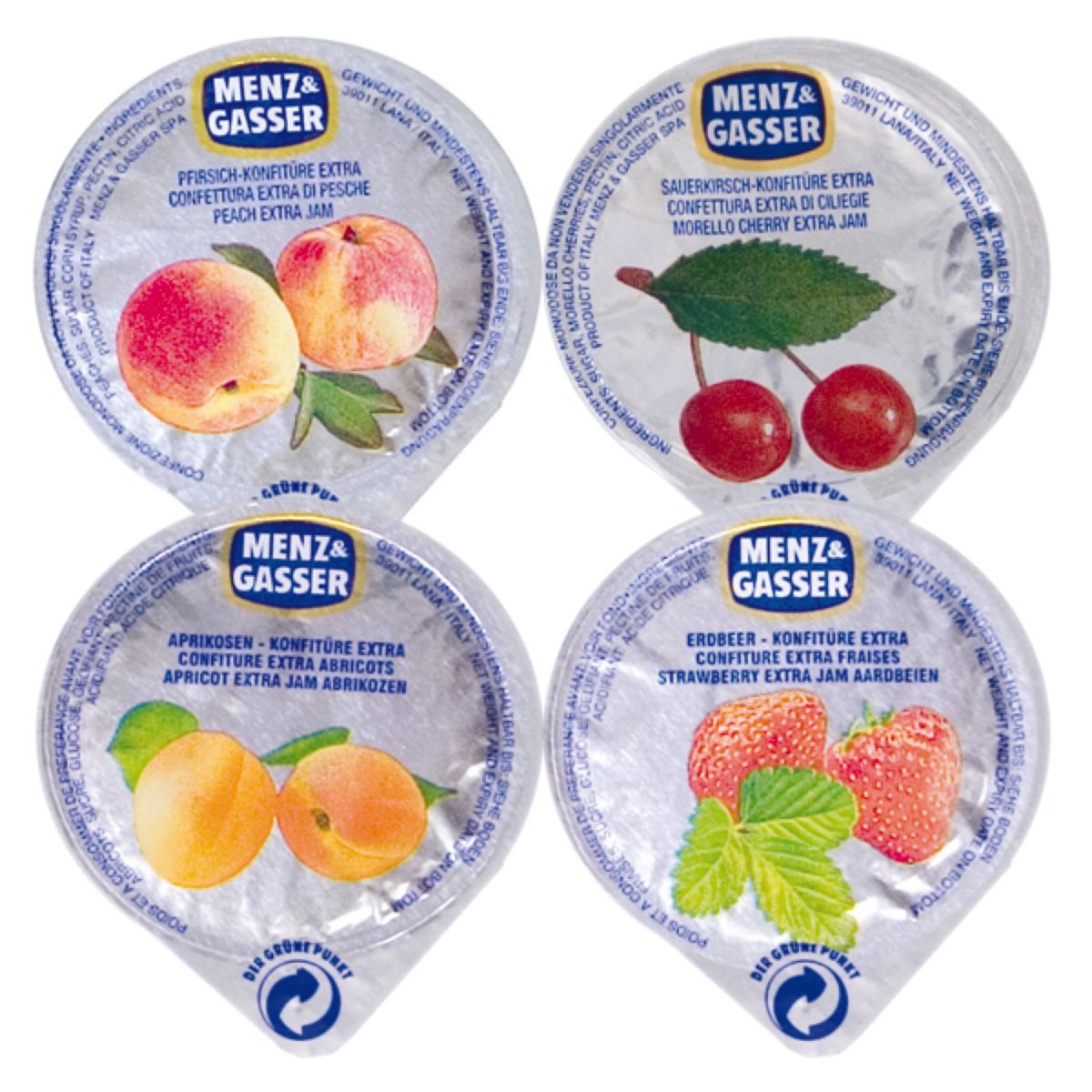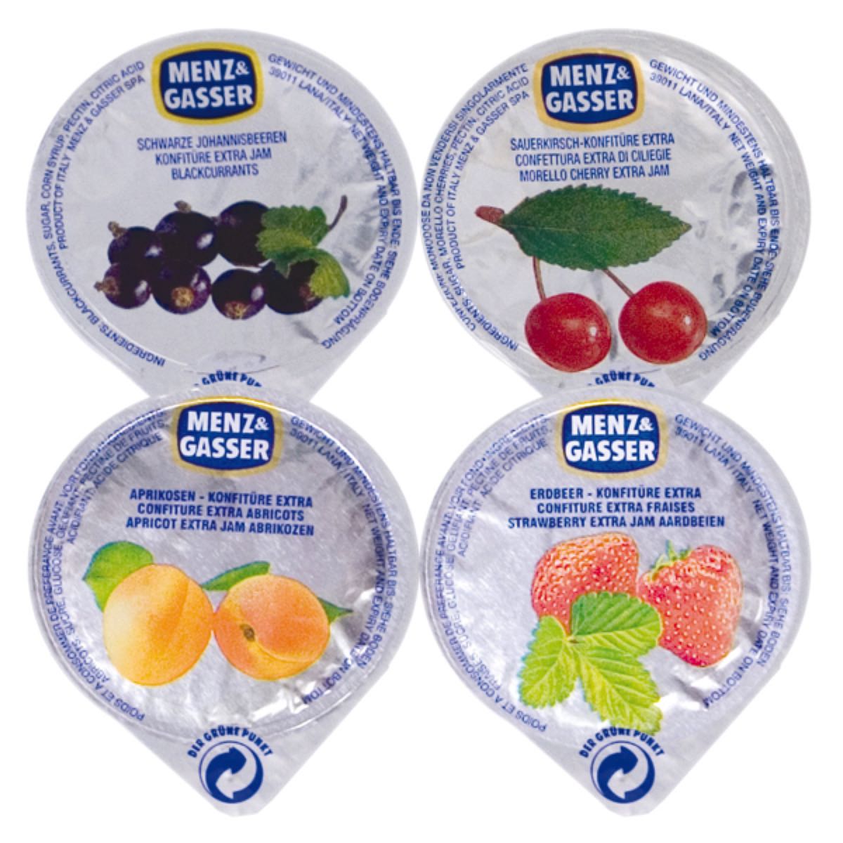 Džemy sortiment EXTRAVýběrová jakost — sortiment 4 druhů (4 x 25 porcí – jahody, meruňky, višně, černý rybíz)Obj.č.: 131EAN: 8008660713508Balení: V kartonu 100 porcí á 25 gProdejní jednotka: KartonMinimální trvanlivost: 12 měsícůSložení: Ovoce (jahody, meruňky a višně – 50 g plodů na 100 g džemu, černý rybíz – 35 g plodů na 100 g džemu), cukr, glukózový sirup, pektin, kyselina citronová. Celkový obsah cukru 60 g na 100 g džemu. Bez chemických konzervačních prostředků.