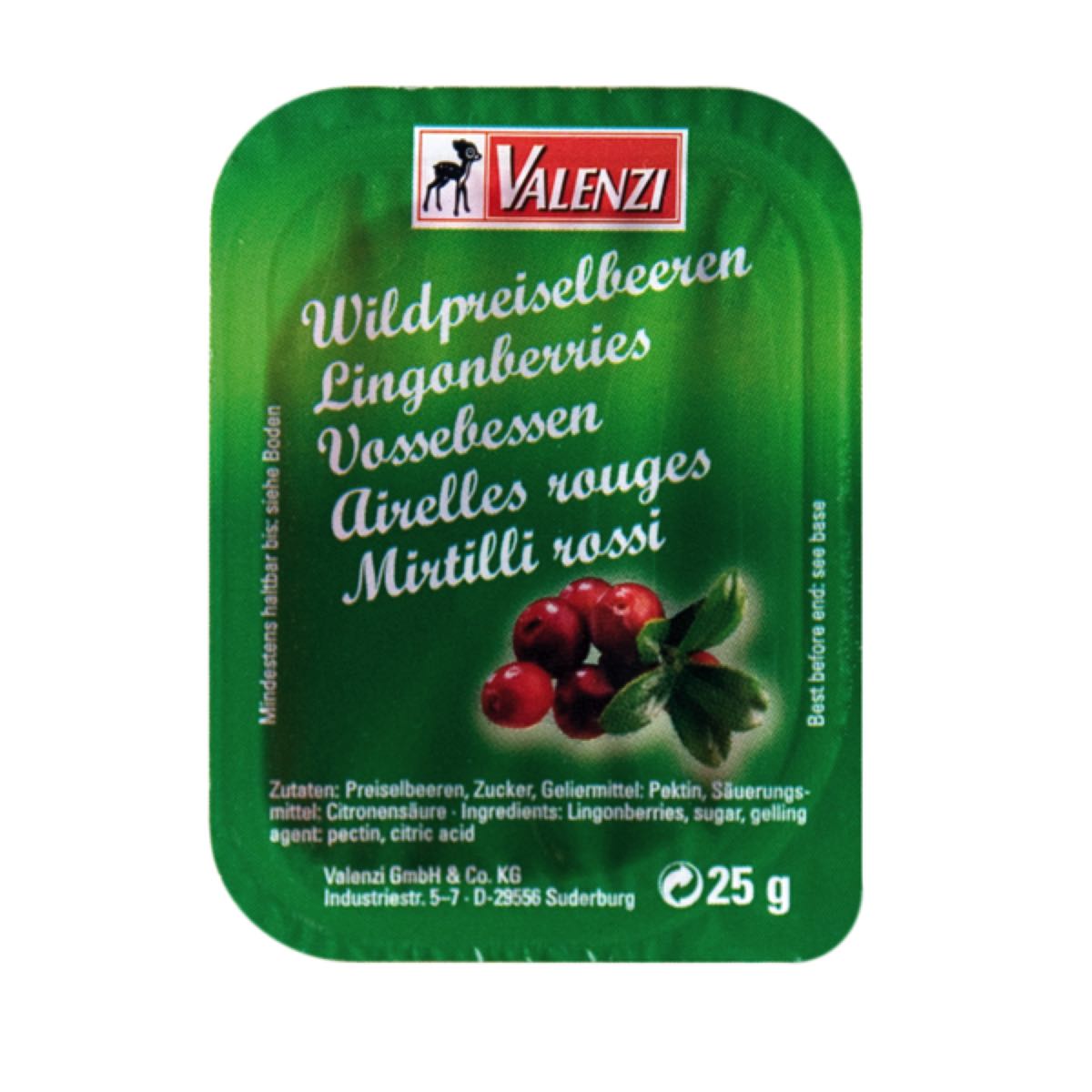 Lesní brusinkyObj.č.: 453EAN: 4100240650709Balení: V kartonu 120 porcí á 25 gProdejní jednotka: KartonMinimální trvanlivost: 24 měsícůSložení: Lesní brusinky, cukr, želírovací prostředek – pektin, regulátor kyselosti – kyselina citronová. Bez chemických konzervačních prostředků.