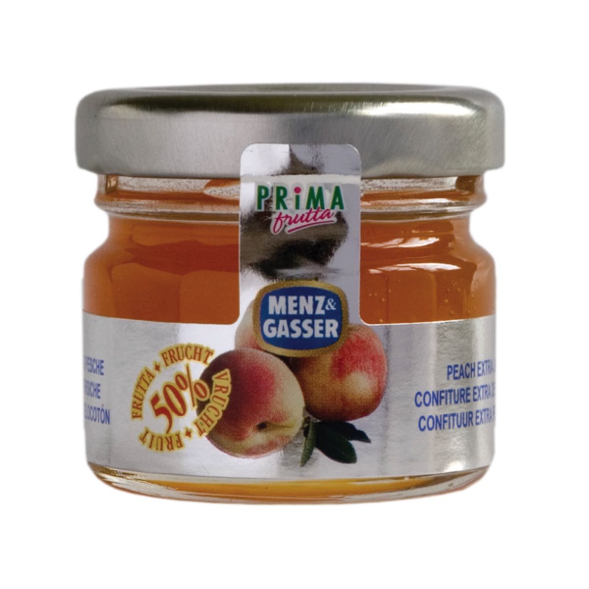 Džem broskvovýDekorativní porcovky ve skleObj.č.: 157EAN: 8008660120085Balení: V kartonu 48 porcí á 28 gProdejní jednotka: KartonMinimální trvanlivost: 18 měsícůSložení: Broskve, cukr, glukózový sirup, pektin, kyselina citronová. Vyrobeno z 50 g plodů na 100 g džemu. Celkový obsah cukru 60 g na 100 g džemu. Bez chemických konzervačních prostředků.