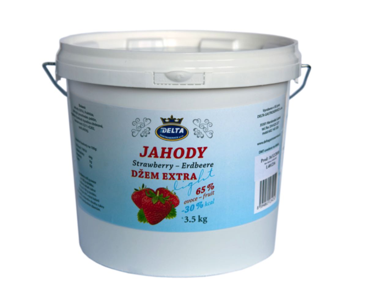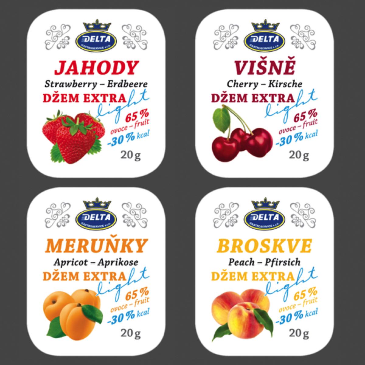 Džemy light – sortiment EXTRAObj.č.: 420EAN: 8594061134207Balení: V kartonu 120 porcí á 20 gProdejní jednotka: KartonMinimální trvanlivost: 12 měsícůSložení: Ovoce (65 %) – jahody, višně, meruňky nebo broskve, fruktóza, želírující prostředek: pektin, regulátor kyselosti: kyselina citrónová, konzervant: E211+E202, oxid siřičitý. Vyrobeno ze 65 g ovoce na 100 g výrobku. Nutriční hodnoty jsou uvedeny na obalu produktu.