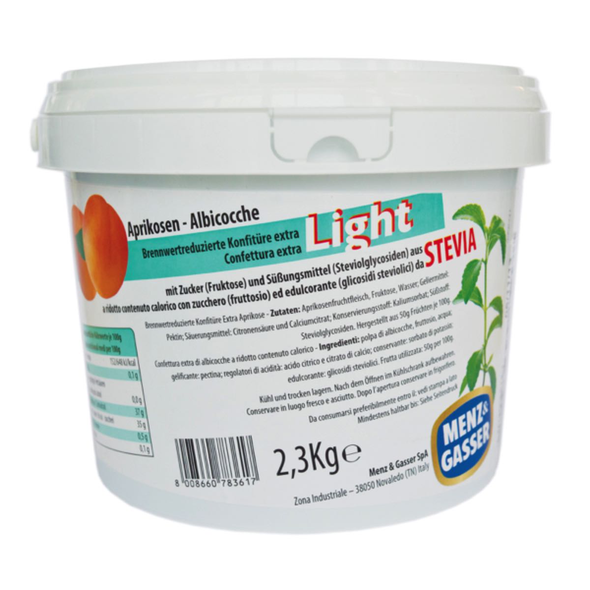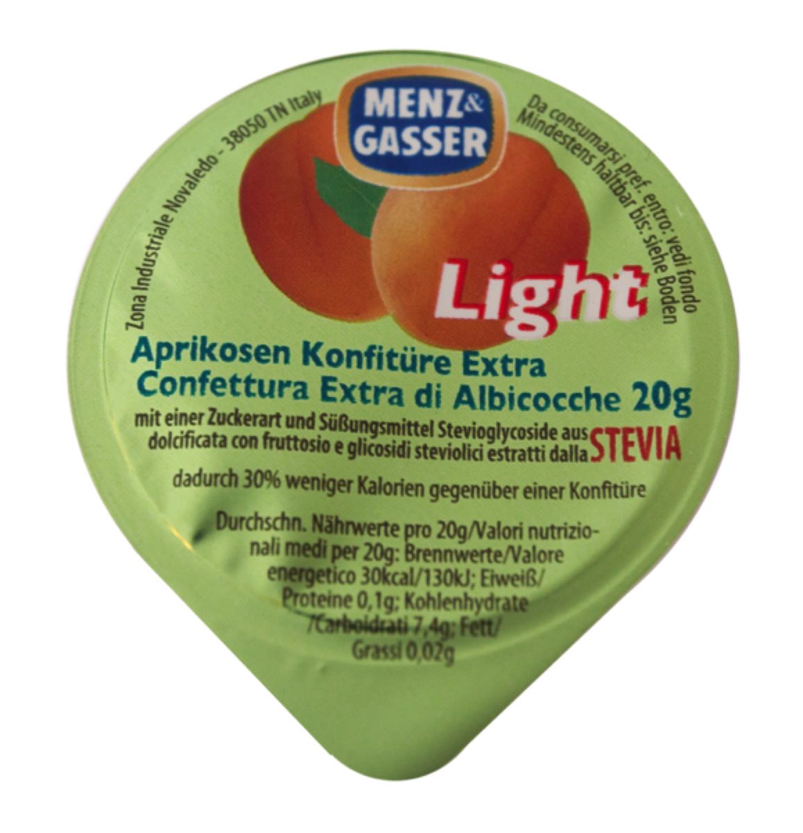 Džem meruňkový lightObj.č.: 437EAN: ---Balení: V kartonu 100 porcí á 20 gProdejní jednotka: KartonMinimální trvanlivost: 12 měsícůSložení: Meruňky, fruktóza, voda, želírující prostředek – pektin, stabilizátor kyselosti – kyselina citronová a citrát vápenatý, konzervant – sorban draselný, sladidlo – Steviol-Glycoside. Vyrobeno z 50 g ovoce na 100 g výrobku. 100 g výrobku obsahuje průměrně 37 g uhlovodanů. Výživná hodnota 648 kJ nebo 152 kcal. Diabetická výživa obzvláště při Diabetes Melitus v rámci dietního plánu. Nutriční hodnoty jsou uvedeny na obalu produktu.