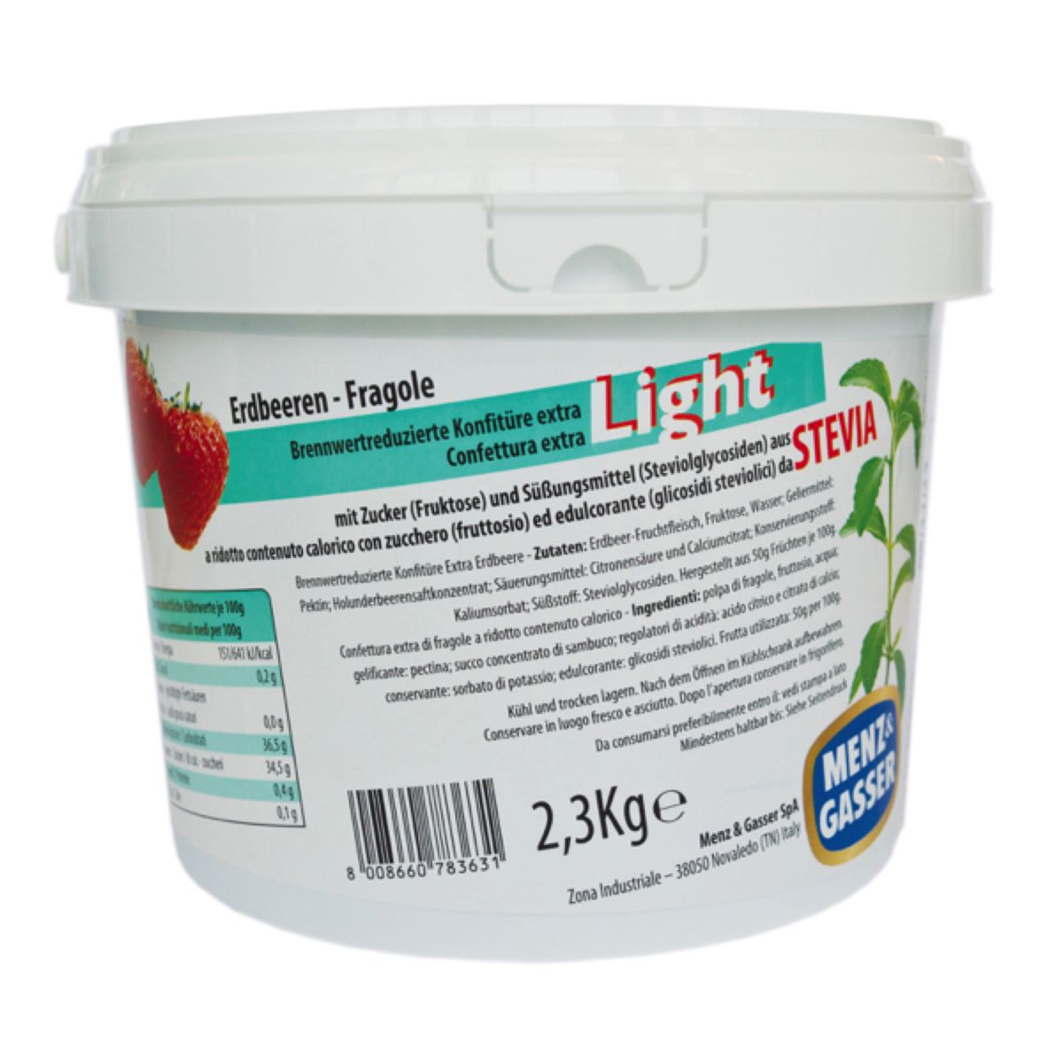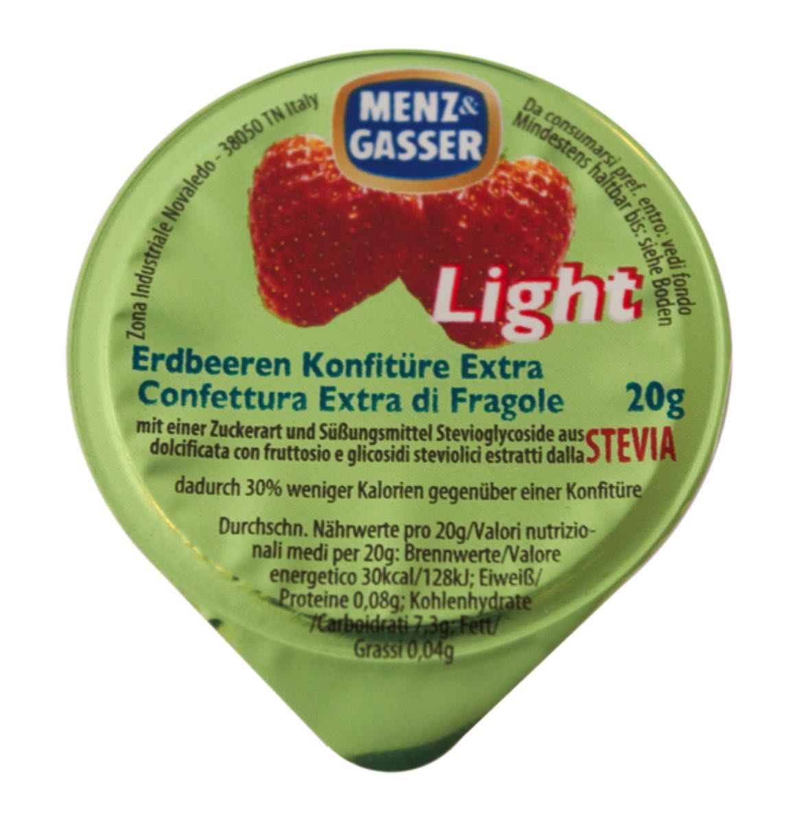 Džem jahodový lightObj.č.: 436EAN: ---Balení: V kartonu 100 porcí á 20 gProdejní jednotka: KartonMinimální trvanlivost: 12 měsícůSložení: Jahody, fruktóza, voda, želírující prostředek – pektin, koncentrát z bezinkové šťávy, stabilizátor kyselosti – kyselina citronová a citrát vápenatý, konzervant – sorban draselný, sladidlo – Steviol-Glycoside. Vyrobeno z 50 g ovoce na 100 g výrobku. 100 g výrobku obsahuje průměrně 36,5 g uhlovodanů. Výživná hodnota 641 kJ nebo 151 kcal. Diabetická výživa obzvláště při Diabetes Melitus v rámci dietního plánu. Nutriční hodnoty jsou uvedeny na obalu produktu.
