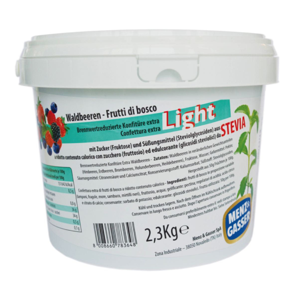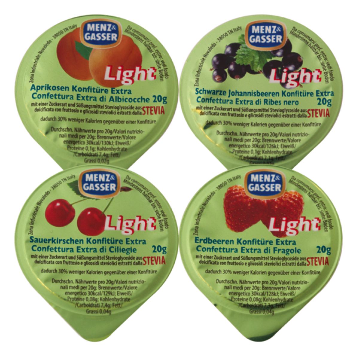 Džemy light – sortiment EXTRAObj.č.: 438EAN: 8008660708726Balení: V kartonu 100 porcí á 20 gProdejní jednotka: KartonMinimální trvanlivost: 12 měsícůSložení: Ovoce, fruktóza, voda, želírující prostředek – pektin, (koncentrát z bezinkové šťávy v jahodovém džemu), stabilizátor kyselosti – kyselina citronová a citrát vápenatý, konzervant – sorban draselný, sladidlo – Steviol-Glycoside.